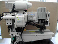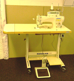 Erweiterbar mit Puller und Nadelkühlung, mit Kessler-Gestell auf Rollen und flexiblem Pedal. Sonderanfertigung für einen Werbemittelhersteller, geeignet um Fahnen, Keder oder Plastikstreifen zu nähen, mit abklappbarer Tischplattenverbreiterung.